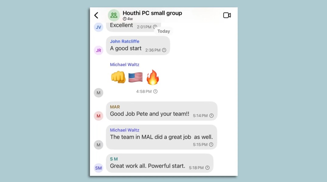 Во разговорот беа вклучени советникот за национална безбедност Мајк Волц, потпретседателот Џеј Ди Венс, директорката на националното разузнавање Тулси Габард, директорот на ЦИА Џон Ретклиф и секретарот за одбрана Пит Хегсет, кој не знаел дека Џефри Голдберг, главен уредник на Атлантик, ненамерно бил вклучен во групната порака.