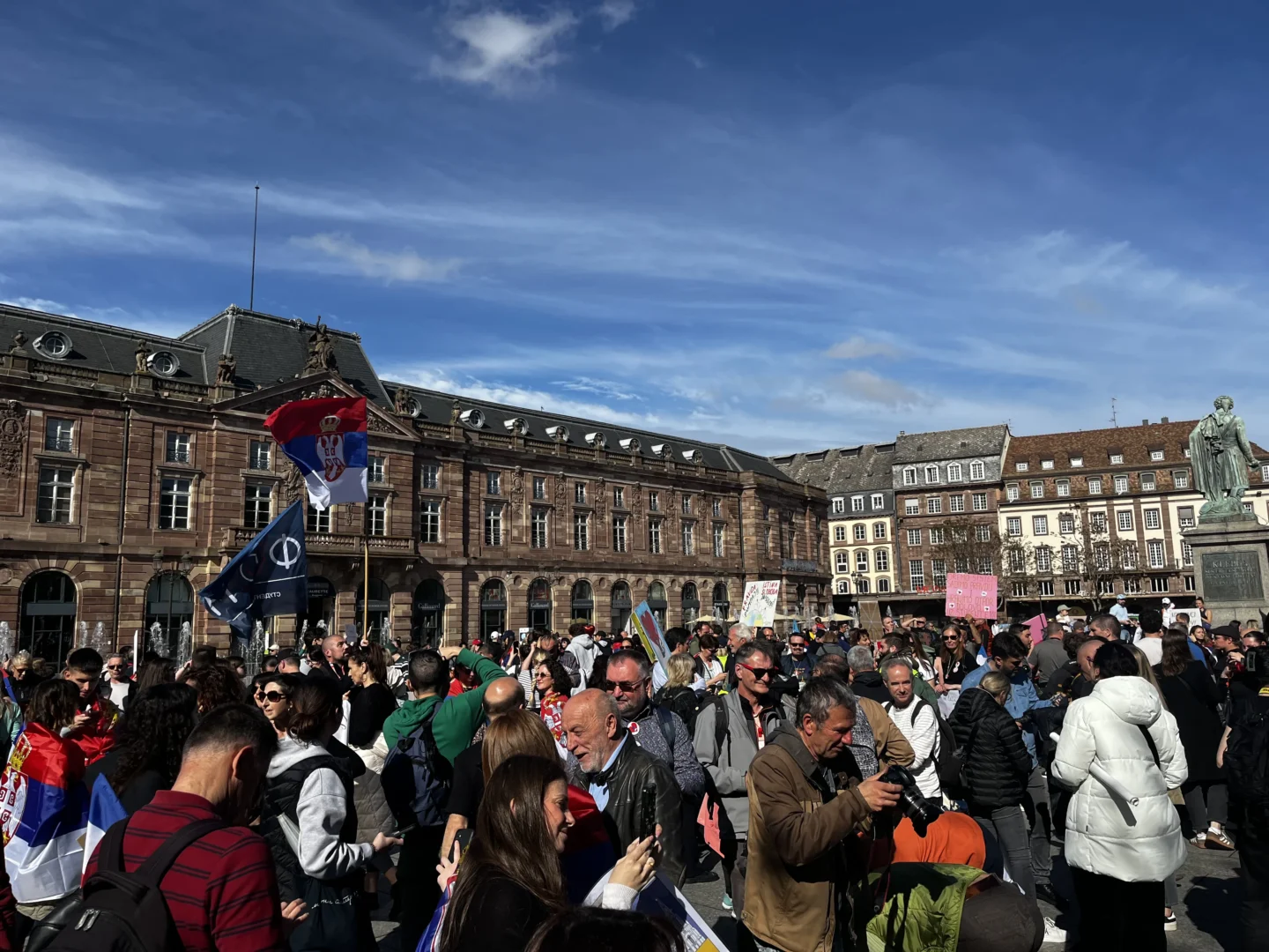 Повеќе од стотина членови на локалната српска дијаспора, како и дијаспората од Швајцарија, Базел и Париз, кои исто така дојдоа да ги пречекаат студентите и да им дадат поддршка, се собраа да ги пречекаат студентите на плоштадот Гутенбер во центарот на Стразбур.