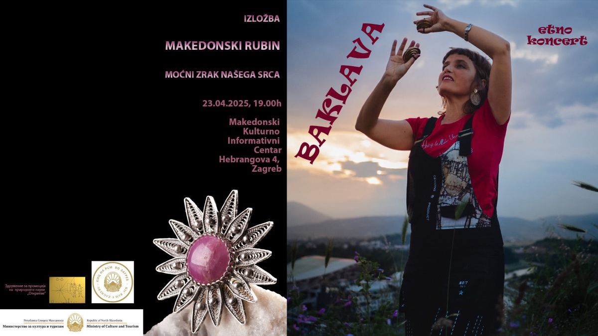 Во македонскиот Културно информативен центар во Загреб во среда, 23-ти април загребската публика ќе има ексклузивна можност да проследи уникатен мултимедијален културен настан во рамките на кој ќе биде отворена изложбата „Македонскиот рубин – моќниот зрак на нашето срце“ и ќе биде одржан етно концерт на групата „Баклава“.