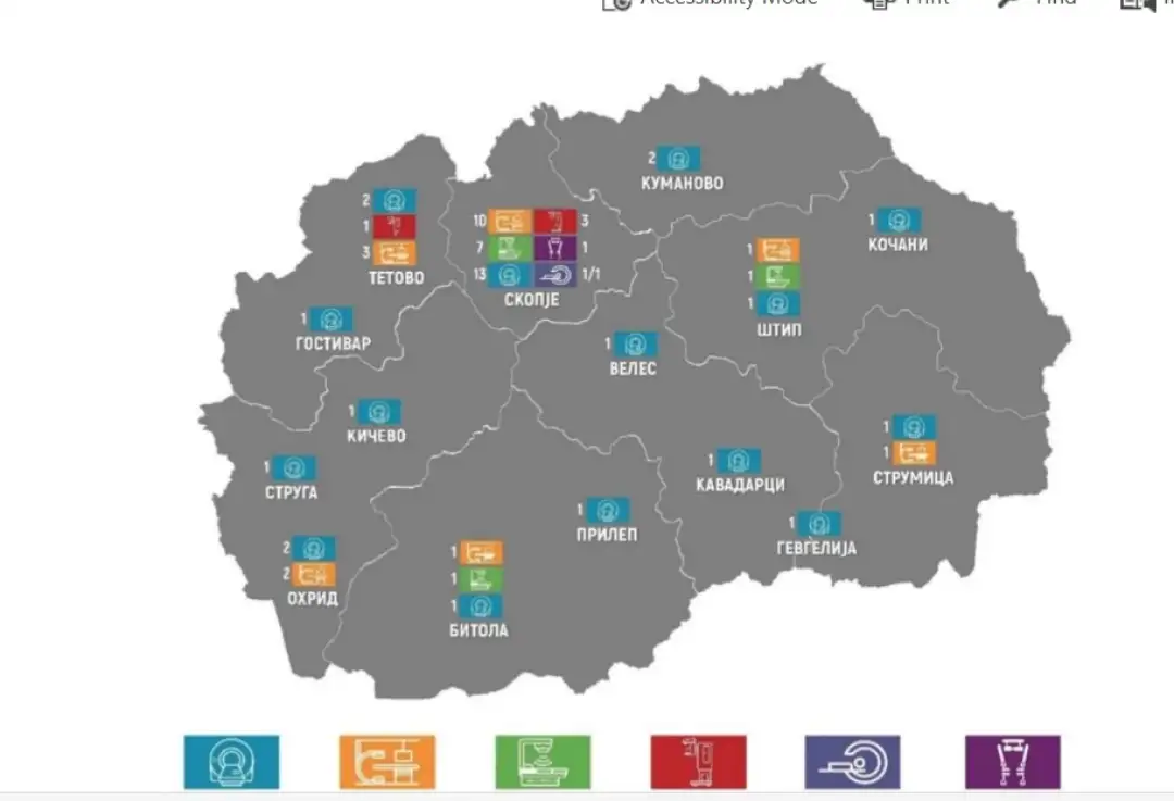Меѓу набавените уреди се 9 линеарни акцелератори за радиотерапија, од кои 5 сè уште не се во функција. Истовремено, Клиниката за радиотерапија и онкологија, единствена што ги нуди овие услуги, работи со преоптоварени капацитети, третирајќи околу 2.300 пациенти годишно.