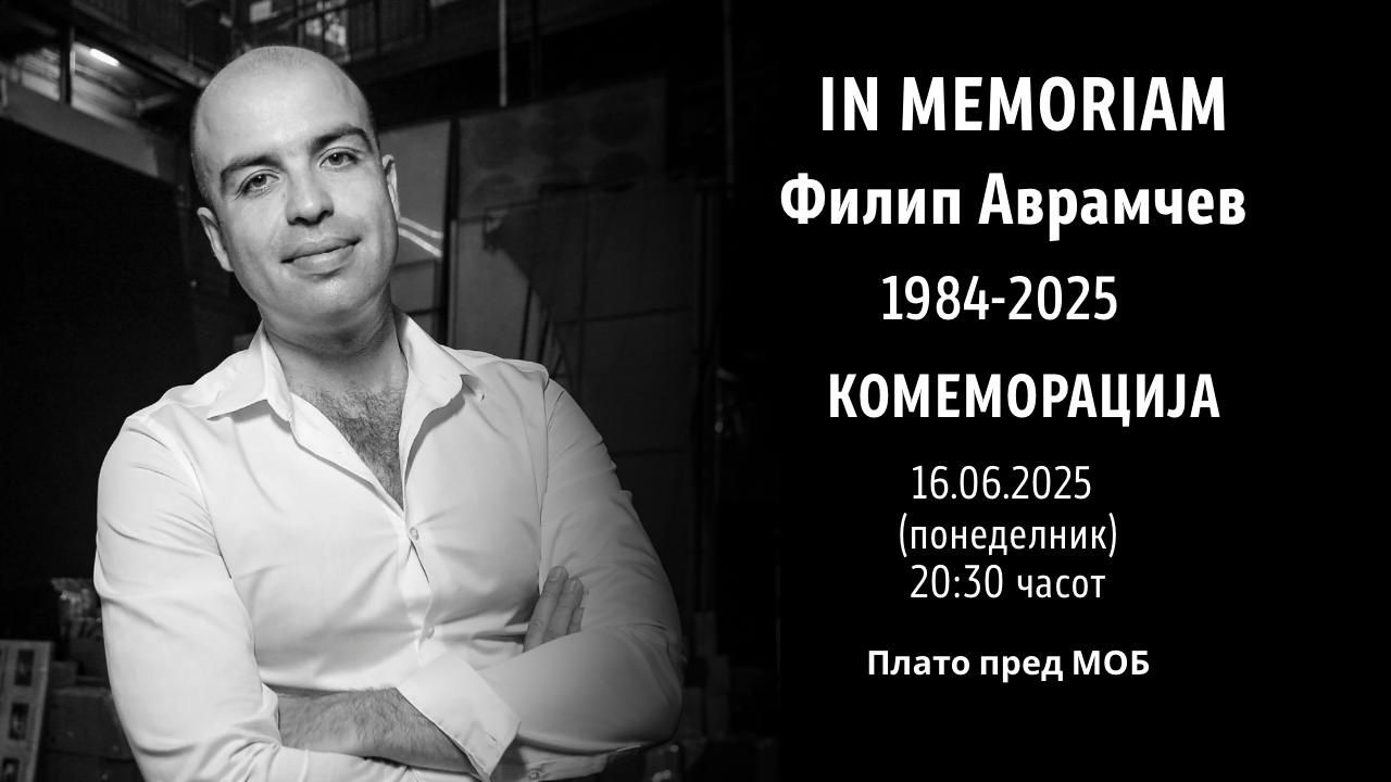 На 16.06 (понеделник) на платото пред МОБ со почеток од 20:30 часот ќе се одржи комеморација за прерано починатиот Филип Аврамчев, поранешен директор на Универзална сала, заслужен за извонредните изданија на Skopje Light Air District, како и еден од организаторите на меѓународната конференција за Вештачка интелигенција АI Tech Summit