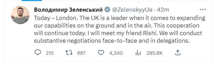 – Денеска – Лондон. Велика Британија е лидер кога станува збор за проширување на нашите способности на земја и во воздух. Оваа соработка ќе продолжи и денеска. Ќе се сретнам со мојот пријател Риши. Ќе водиме суштински преговори лице в лице и помеѓу делегациите, напиша Зеленски на Твитер.