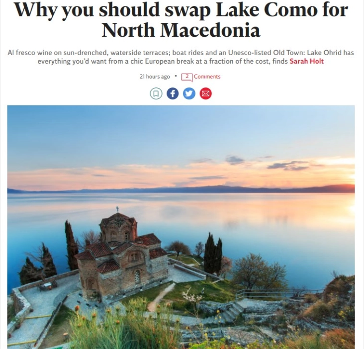 Луѓе пијат аперол и еспресо и грицкаат пица, со главите свртени кон паунско-зелената вода, опколена од ридови полни со вили. Сцената не е поинаква од езерото Комо – но јас сум 1.300 милји оддалечена од северна Италија, во Охрид, на југозападниот дел Северна Македонија. Охрид полека влегува во радарот на туристите од Обединетото кралство, благодарение на неодамна воведените директни летови на „TUI“ од Манчестер и „Гетвик“,