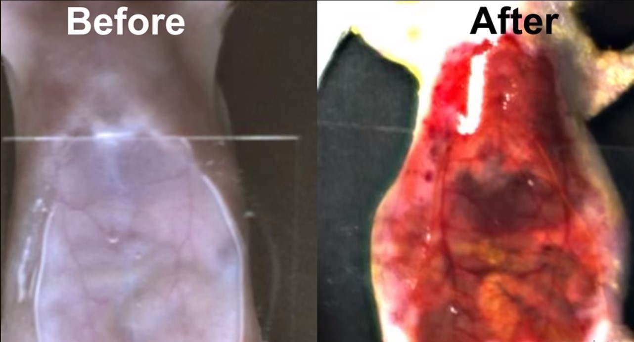 Тимот потоа ја намачка жолтата боја на долниот дел на глувчето, правејќи ја абдоминалната кожа провидна и откривајќи ги цревата и органите на глодарот. Во друг експеримент, тие нанесоа боја на избричената глава на глушец и, со техника наречена ласерско снимање на контраст со дамки, ги видоа крвните садови во мозокот на животното.