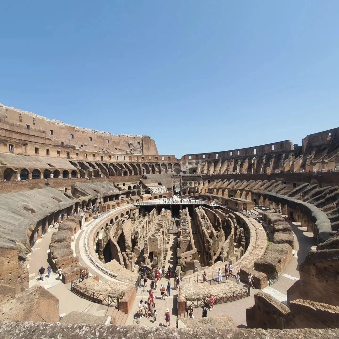 Кога ќе влезеш во едно од Седумте светски чуда на Новиот свет, Флавиевиот амфитеатар, како што е наречен Колосеумот, забораваш на горештината и се губиш во големината. Тој е грандиозно издание со импозантни димензии не само за тоа време. Колосеумот е најголемиот антички амфитеатар некогаш изграден и сè уште е најголемиот амфитеатар во светот. Бил изграден за време на царот Флавиј Веспазијан во 72 г.н.е., а го довршил неговиот син царот Тит Флавиј Сабин Веспазијан. Во Колосеумот за забава на народот се одржувале гладијаторски борби и борби помеѓу животни, егзекуции, реконструкции на познати битки и драми засновани на римската митологија, а во различни историски моменти собирал од 50.000 до 80.000 гледачи. Престанал да се користи за забава во раниот средновековен период. Подоцна бил користен за домување, работилници, како место за верски обреди, тврдина, каменолом и христијанско светилиште. Малку се два часа ако сакаш убаво да го видиш Колосеумот, а препорачувам да си земите и аудио водич за да ви ги раскаже приказните.