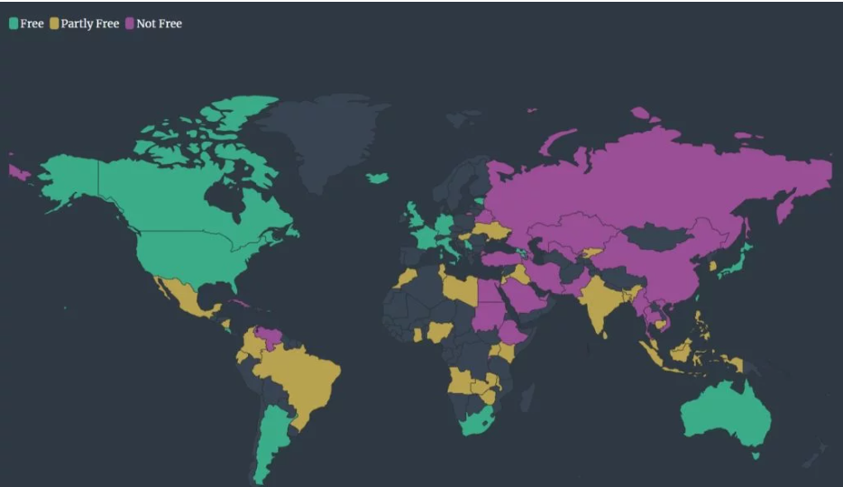 Најниска слобода во интернет просторот има во Кина, Мјанмар и Иран. Понатаму следуваат Виетнам, Венецуела, Узбекистан, Турција, Русија, Белорусија, Куба.