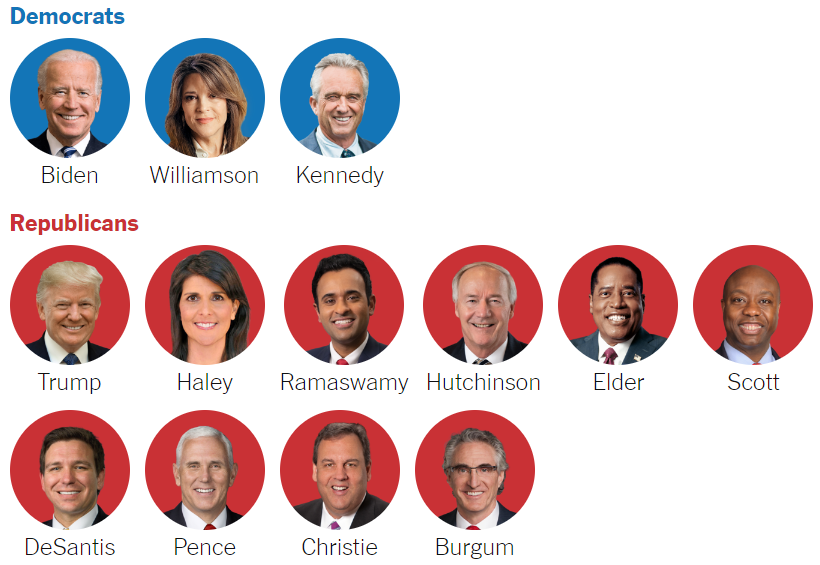 Заедно со Трамп и Десантис, во трката за републикански претседателски кандидат се и поранешната амбасадорка на САД во ОН Ники Хејли, сенаторот од Јужна Каролина Тим Скот, поранешниот гувернер на Арканзас Ејс Хачинсон, водителот Лери Елдер и претприемачот Вивек Рамасвами. Поранешниот гувернер на Њу Џерси, Крис Кристи, планира да ја започне својата кампања на 6 јуни, а гувернерот на Северна Дакота, Даг Бургум на 7 јуни.