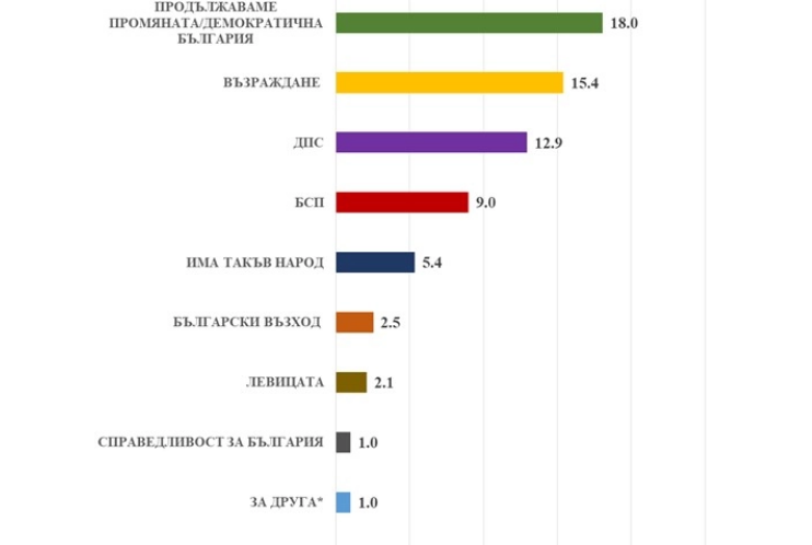 Истовремено, одговорите на прашањето „За кого би гласале доколку изборите се одржат денеска“ покажуваат дека во парламентот би влегле истите партии кои сега се во Народното собрание и во иста конфигурација. За ГЕРБ-СДС би гласале 23,3 отсто, за „Продолжуваме со промената – Демократска Бугарија“ – 18 отсто, за „Преродба“ 15,4 отсто, за ДПС 12,9 отсто, за БСП – 9 отсто, за „Има таков народ – 5,4 проценти, пренесува БТА.