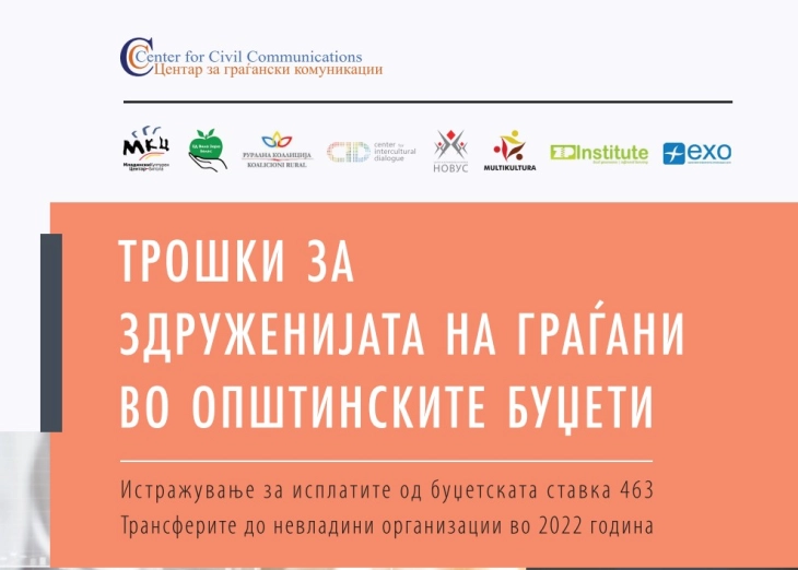 Центарот за граѓански комуникации (ЦГК) денеска го објави истражувањето „Трошки за здруженија на граѓаните во општинските буџети“, во кое се заклучува дека здруженијата на граѓани и фондации во земјава не ја добиваат потребната финансиска поддршка од општинските буџети. Во просек, општините во 2022 година им доделиле за здруженијата на граѓани само 0,1 % од своите буџети.