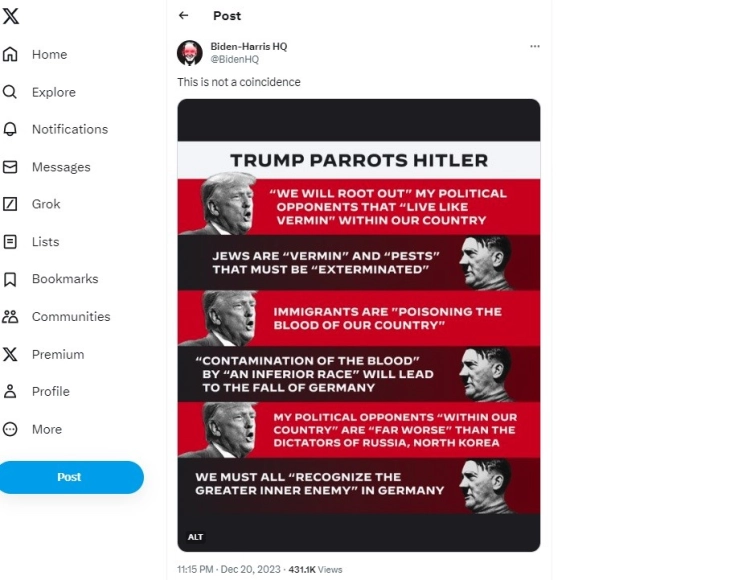 Се работи за три цитати од говорите на Трамп што многумина во САД ги потсети на некои зборови кажани од Хитлер. Во твит на кампањата на Бајден на социјалната мрежа Х (поранешен Твитер) сликата е насловена „Трамп го повторува Хитлер како папагал “ со коментар „Ова не е случајно“.