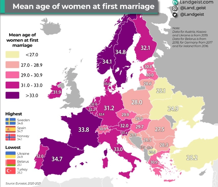 Жените во С. Македонија најмлади стапуваат во брак споредено со другите земји во регионот. Просечната возраст на која Македонките се мажат е 26,6 години, покажува анализата на статистичкиот портал „Ландгеист“, базирана на податоци на Евростат.