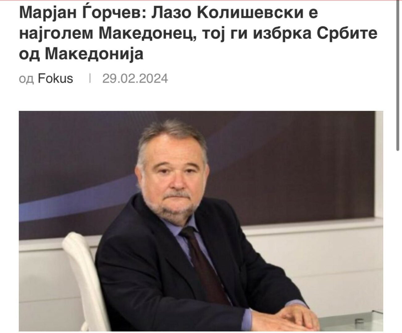 За Марјан Ѓорчев, пак, поранешен министер и пратеник од ВМРО-ДПМНЕ, Лазо Колишевски бил најголем Македонец: „Лазо Колишевски е најголемиот Македонец за мене. Човек што ги избркал Србите од Македонија и им го одзел целиот имот. Тој е погрешно интерпретиран во македонската историја“, вели Ѓорчев.