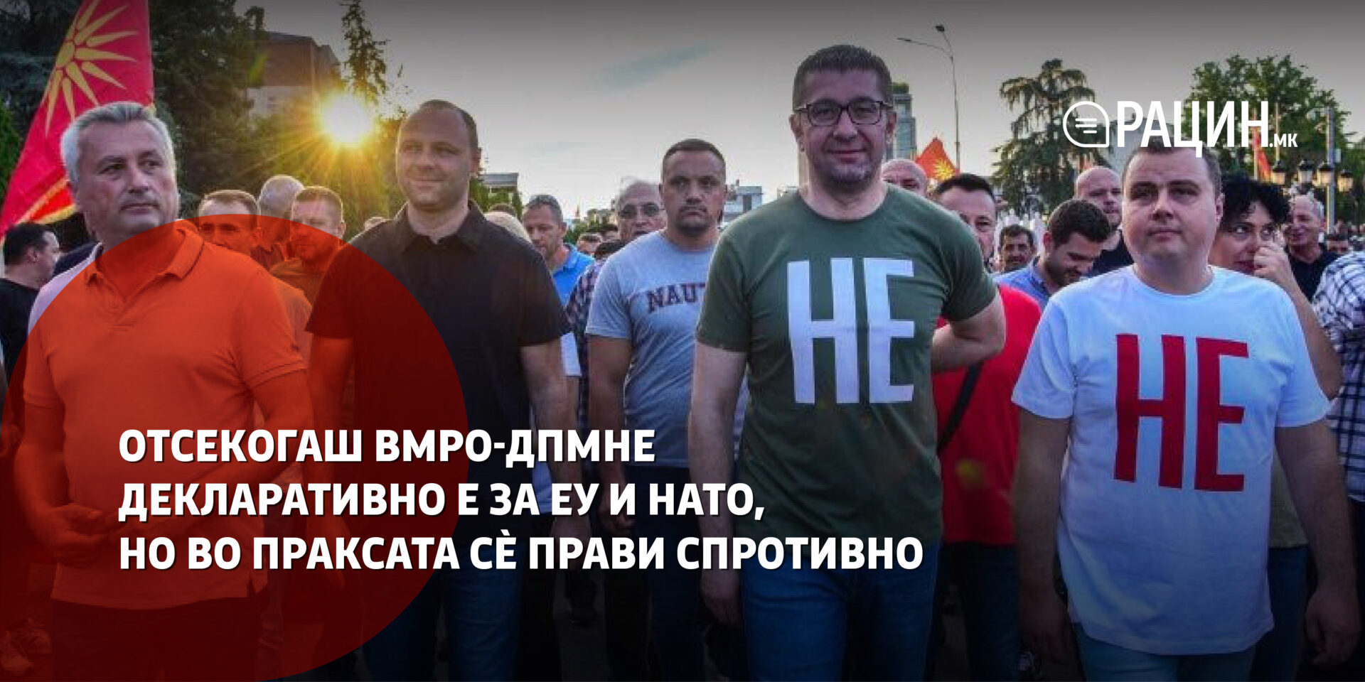 Повеќе од 30 години, ВМРО-ДПМНЕ и нивните претставници декларативно се изјаснуваат дека се за НАТО и членство во ЕУ, но активностите кои ги преземаат и нивното политичко делување никако не соодветствува со таквите изјави.