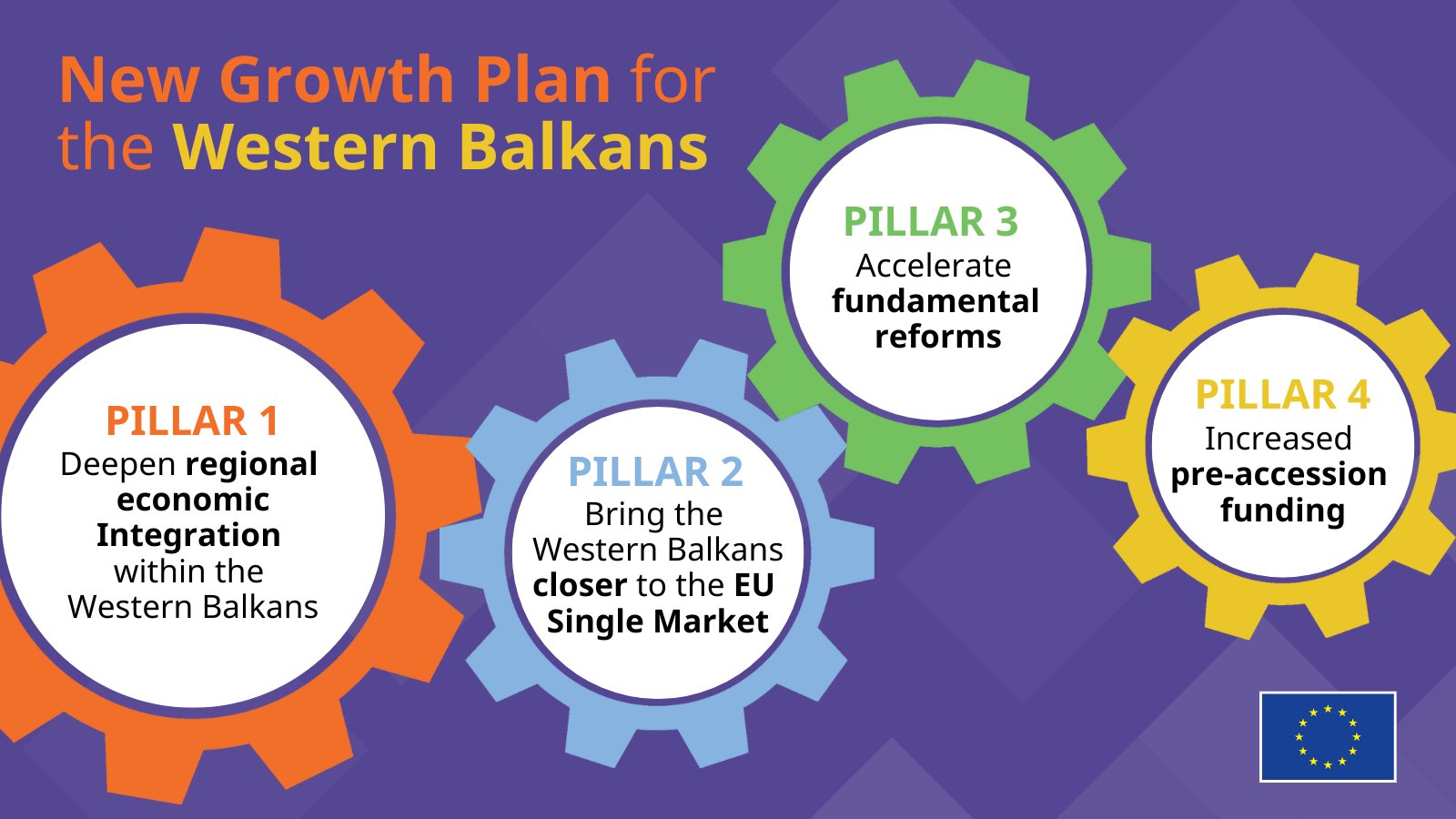Четирите основи столба на кој ќе се базира Планот за раст на Западниот Балкан се подобрување на економската интеграција на земјите од регионот со единствениот пазар на ЕУ, зајакнување на економската интеграција државите од регионот во заеднички регионален пазар, забрзување на фундаменталните реформи и зголемување на финансиската помош за поддршка на реформите преку Фондот за реформи и раст за Западниот Балкан, како нов инструмент во вредност од 6 милијарди евра неповратна поддршка за спроведување на основните и социо-економските реформи.