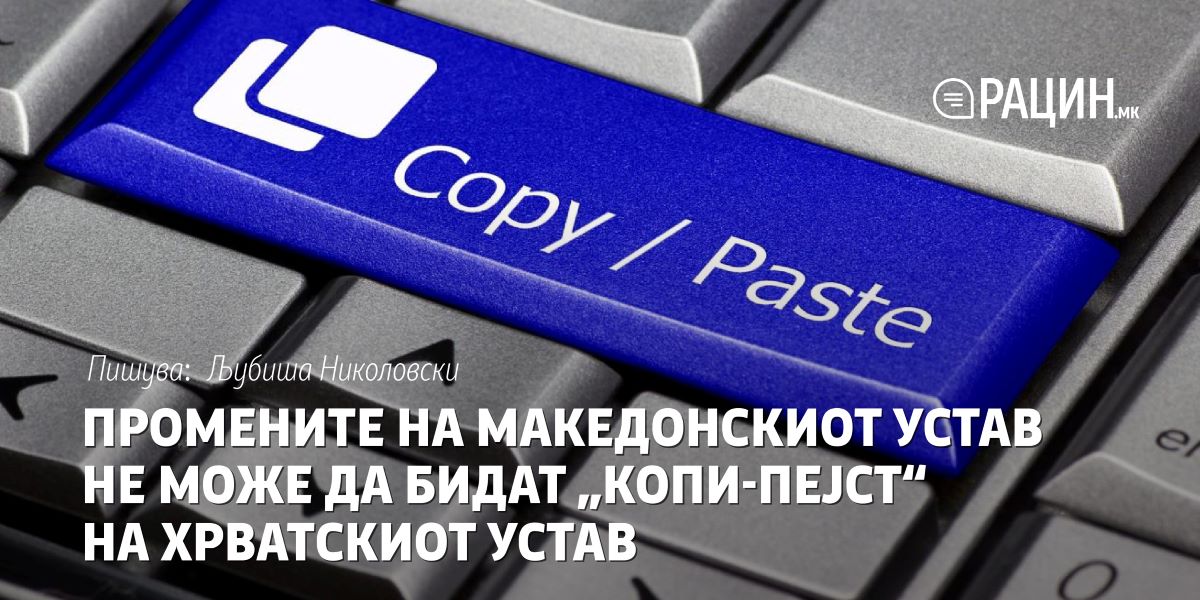Инаку за воља на вистината идејата не беше да се преслика хрватскиот Устав буквално, во целост, туку да се пресликаат оние елементи кои усшешно би се примениле на македонските прилики. Македонија нема потреба да копира туѓи уставни решенија кои не кореспондираат со нашата реалност. Дотолку повеќе што Македонија е суверена држава која самата си ги носи одлуките за своето внатрешно уредување, не срамејќи се да користи и туѓи искуства по одредени прашања, ако за тоа има потреба.