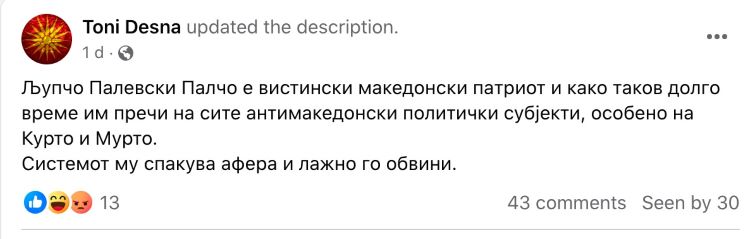 Дел од радикалните десничари, кои шират дезинформации и теории на заговор и се против прогресот на државата и евроатлантската ориентираност, застанаа во одбрана на Љупчо Палевски Палчо, човекот кој беше организатор и егзекутор на киднапирањата и убиствата на 14-годишната Вања Ѓорчевска и пензионерот Панче Жежовски од Велес.