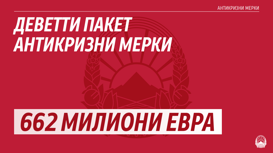 Новиот деветти пакет антикризни мерки во вредност од 662 милиони евра, што го утврди Владата на Република Северна Македонија, содржи 26 мерки со кои се таргетирани поддршка за ранливите категории на граѓани и компании како и поддршка во услови на зголемени трошоци на живот и продолжени ефекти од енергетската криза.