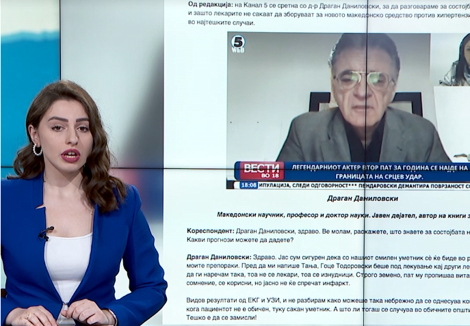 Даниловски сподели и линк, кој води до веб страница што користи лого на ТВ Канал 5 и скриншотови, за да пласира лажни вести за здравјето на познат македонски актер и да рекламира чај што наводно лечи болести на срцето и крвните садови. Во текстот има и интервју со д-р Даниловски од вести на Канал 5, во кое тој наводно тврди дека чајот е „НАЈДОБРОТО средство за борба против болести на срцето и крвните садови, не само во Македонија, туку и низ целиот свет…“.