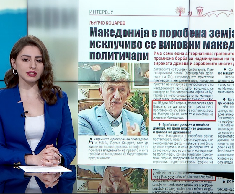 На пример, на 4 април 2024, неделникот „Македонско ехо“ објави интервју со академикот и доскорешен претседател на МАНУ Љупчо Коцарев, во кое тој заклучува дека „Владата, за да започнат пристапните преговори со ЕУ, веќе се согласила дека во Македонија не живеат и никогаш не живееле Македонци“. За ова тврдење, Коцарев ги зема предвид договорите со Грција и Бугарија, и преговарачката рамка како „официјален документ на ЕУ“.