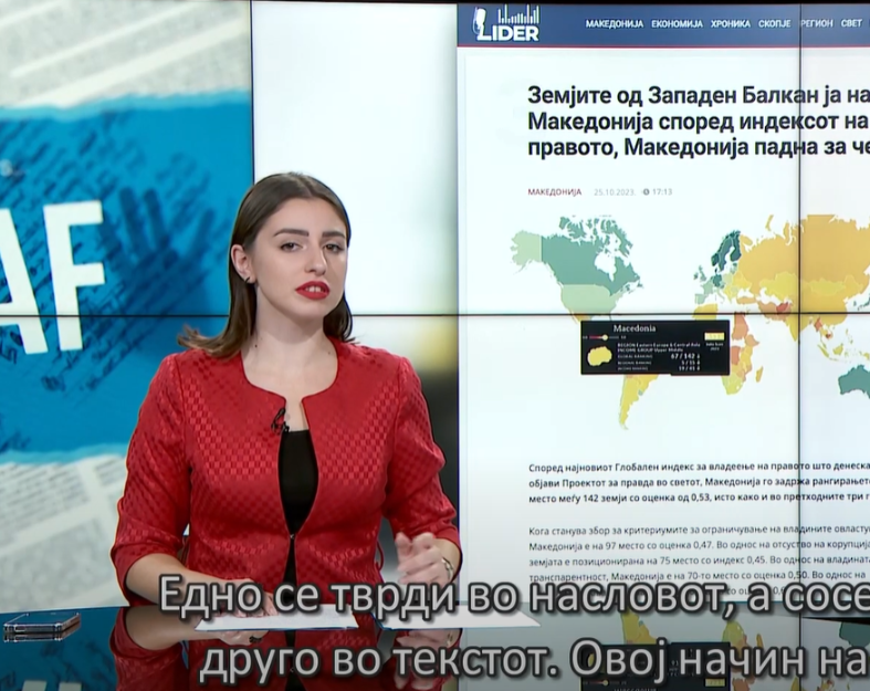 Таков е и примерот со порталот Лидер.мк, кој на 25.10.2023 година објави текст со наслов: „Земјите од Западен Балкан ја надминаа Македонија според индексот на владеење на правото, Македонија падна за четири места“.