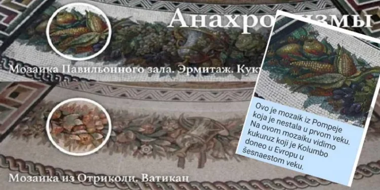 Како и во секоја “добра” “теорија” на заговор, и во оваа има ронка вистина (античкиот изглед на мозаикот, фактот дека самата слика со пченките навистина постои итн.), но таа е нерелевантна во однос на фејкираниот заклучок. Зошто ли, зошто, не сум изненаден (сега со право)…
