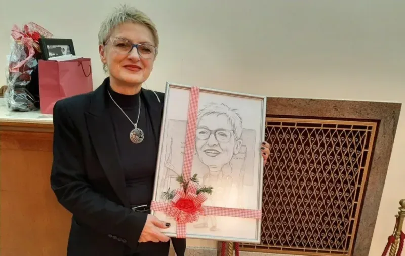 Нејзините колеги, собраниските известувачи од другите медиуми ѝ подарија портрет, со диктафончето во рака закачено на антена бидејќи таа за да не се испречува пред помладите колеги додека зема изјава на врвот од метална прачка – антена, која можеше да се попушта и собира, таа го врзуваше својот диктафон, за полесно да ги зема изјавите.