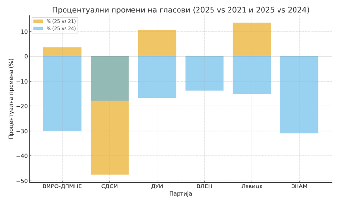 ВМРО-ДПМНЕ ја задржа својата водечка позиција, но покажува знаци на заситеност на партиската гласачка база. Падот од парламентарните избори потврдува дека партијата е силна во бројки, но слаба во мобилизација, или уште поважно ранлива од актуелните случувања. Гласачите можеби им простија на некои од кандидатите на оваа партија од локалните избори во 2021 година, но ако нема нова енергија и испорачани резултати партијата ќе продолжи да ги губи урбаните општини и многумина од независните гласачи. За потребата од политичка свежина и повеќе резултати погледнете ги наглиот пораст споредено со 2021 година, но и исто толку наглиот пад во однос на 2024 година.