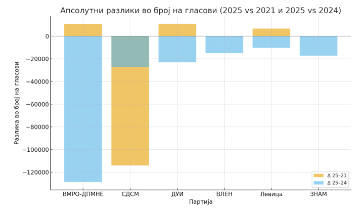 Апсолутните разлики пак, откриваат дека ВМРО-ДПМНЕ и СДСМ имаат најголеми загуби во реални гласови, што потврдува дека доминацијата на едната и падот на другата не произлегуваат од нова поддршка, туку од неактивност на гласачите.