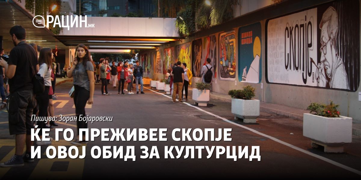 Но, Скопје, како и многу парти досега, ќе го преживее и овој обид за културцид. Ќе ја преживее оваа вмровска градска власт и оваа градоначалничка. Таа, во нејзината изборна програма во делот на културата запиша дека „на Скопје му се потребни нови принципи кои ќе ја истакнат културата како важен столб на градскиот живот. Поттикнувајќи ја нејзината видливост, имаме обврска да обезбедиме услови за нејзин развој“, а ништо не направи за да го реализира тоа.