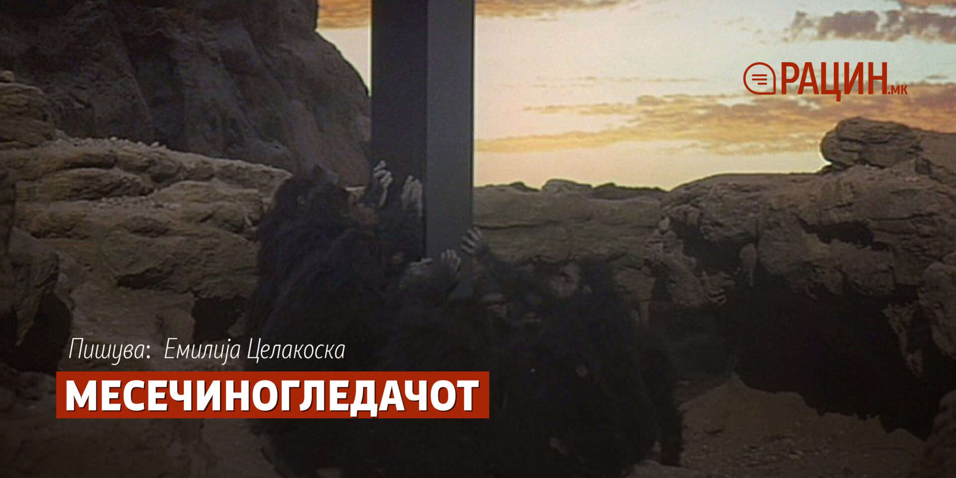Заведувачкиот 24-ти дел од секундата нѐ транспортира веднаш – од долгата коска фрлена нагоре, кон цилиндричен вештачки сателит во орбита, три милиони години потоа. Тој преод во Кјубриковиот филм го има „одработено“ црниот монолит поставен од вонземска цивилизација која пред многу милиони години си зацртала да наоѓа потенцијални паметковци низ галаксијата за да им го стимулира развојот со вакви направи.