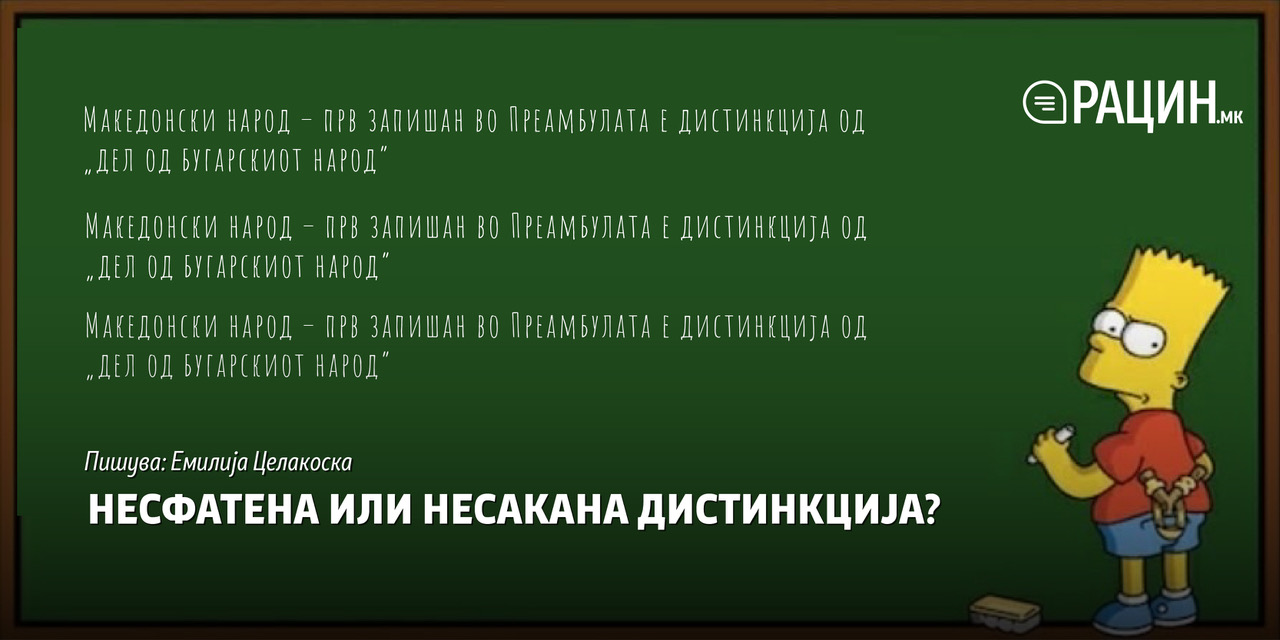 Бугарското инсистирање дека немало дистинкција меѓу македонскиот и бугарскиот народ, Македонија можеше да го пресече уште одамна, кога Преамбулата на македонскиот Устав почна да набројува делови од народи. Уште тогаш рамката била подготвена за се направи тоа разграничување меѓу македонскиот и бугарскиот народ. Активно да ја употреби „јасноста на дистинкцијата“ со запишување на „дел од бугарскиот народ“ во Уставот каде што се и другите делови од народи, макар и само еден бугарски граѓанин да има во Македонија. Така, досега ќе беше официјално: Македонски народ – прв запишан во Преамбулата е сосем различно од „дел од бугарскиот народ“, таму некаде наброен при крај. Би било веќе запишано црно на бело во Устав – не помалку! – дека бугарските граѓани овде се „дел“ од сосем друг народ, не македонскиот. Зошто тоа не е пресечено вака од порано, зошто дистинкцијата не се запишала во овој највисок документ, сигурно тие што ги следат процесите од поблиску – подобро знаат.