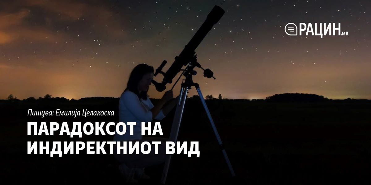 Во осумдесеттите, улиците и, воопшто, градот, беа помалку светли отколку подоцна. Затоа на ноќното небо се гледаа и слаби точки од ѕвезди. Во тие малечки години, открив дека токму слабиот сјај повеќе може да се види доколку не се гледа директно, туку малку настрана. Називот на ефектот го дознав многу подоцна, со појавата на интернетот (ништо спектакуларно – “averted vision”, индиректен вид). Го побарав името на овој ефект, бидејќи низ годините, одвреме-навреме ќе се појавеше да ми соли памет и за други работи: „Слабо ќе гледаш ако директно го вперуваш погледот“. И постојано борби со него: „Добро, како воопшто да дознаам било што без да го вперам погледот директно?!“ Понекогаш ми даваше навистина неприфатлива утеха: „Ако не гледаш сега, ќе видиш кога нема да си толку запната да видиш“. Тешко е човек да застане кога мисли дека е на пат да види нешто, но, за чудо, нему, на солачот на памет, му успева магично и до ден-денес да ме изненади. И до најтривијалното ниво, на пример, кога барам некое зафрлено предметче: Дури кога ќе се откажам, ама вистински да се откажам, тоа ќе се појави. Целата активна работа се состои во тоа – чесно да се откажам. А тоа е толку многу тешко, и за барање на играчки, и за барање на некое знаење или согледување.