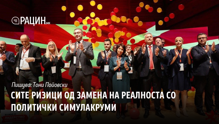 Преведено во термини на современата политика, политичкиот симулакрум се однесува на манипулација со слики, симболи или наративи за да се обликува јавната перцепција, да се контролира дискурсот и да се освои и задржи политичката моќ. Визуелизацијата на политичката кампања, гестовите и говорите целат кон масовна прифатливост и осигурување поддршка за кандидатите, нивната личност и наратив, проследено со пропаганда и спинови со цел да се изманипулира јавното мислење во сопствена полза. Како што може да согледаме и во македонската изборна стварност, овој пристап вклучува ширење на погрешни информации, врамување прашања на тенденциозен начин или користење на нагласено емоционални повици за да се обликуваат наклонети чувства на јавноста и избирачите. Истовремено, со новите дигитални техологии и социјалните медиуми, создадена е овозможувачка околина за пласирање на ефективни политички симулакруми. Вратата за дезинформации и лажни вести е целосно отворена и создадени се ехо комори каде што поединците се изложени само на информации што ги зајакнуваат нивните постоечки верувања.