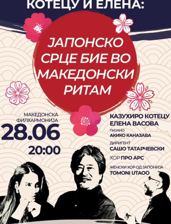 Вечерва во Македонската филхармонија љубителите на класичната музика ќе уживаат во единствен концерт што ги спојува традициите на Далечниот Исток и Балканот. Јапонскиот баритон Казухиро Котецу и македонската сопранистка Елена Васова ќе настапат заедно во програмата со наслов „Јапонско срце бие во македонски ритам“, носејќи силна порака на културно пријателство.