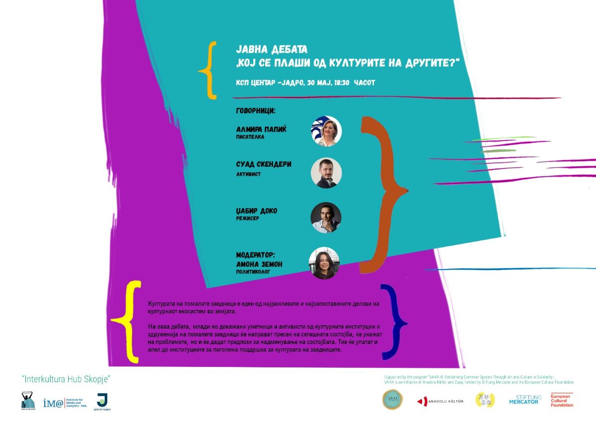 Јавната дебата „Кој се плаши од културите на Другите?“ е дел од проектот „Интеркултурен хаб Скопје“ на ЗГ Есперанца Светски културен центар, Институтот за медиуми и аналитика ИМА и Центар Јадро Скопје, кој е поддржан од програмата „Ваха 3: Враќање на јавните простори преку уметноста и културата во солидарност“. Ваха е Иницијатива на Анадолу култур и Зуса, финансирана од Фондацијата Меркатор и Европската културна фондација.