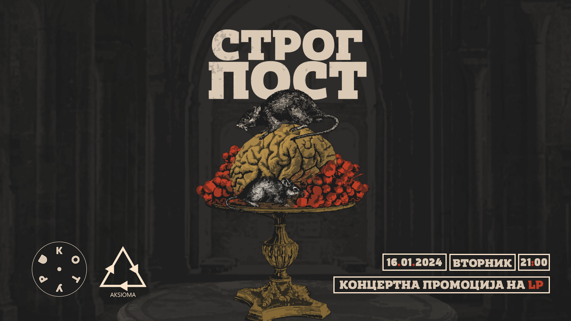 Денеска во 21 часот во Котур ќе се одржи концертна промоција на деби албумот на составот „Строг пост“. Албумот воедно е и прв албум на новото музичко издаваштво на „Аксиома“, асоцијација која организира интердисциплинарни и мултиуметнички настани и проекти.