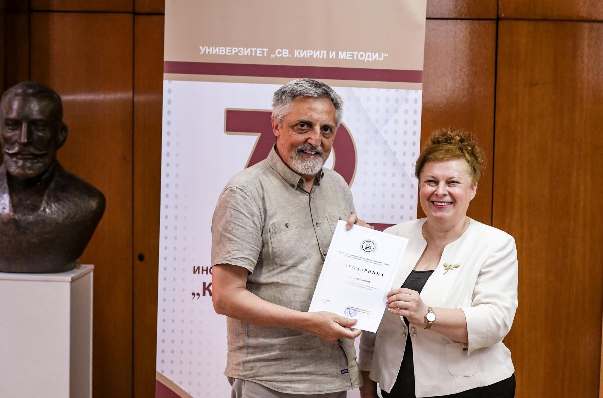 ИМЈ „Крсте Мисирков“ оваа благодарница за порталот ја доделува по повод значајниот јубилеј – 70 години од основањето на Институтот за македонски јазик.