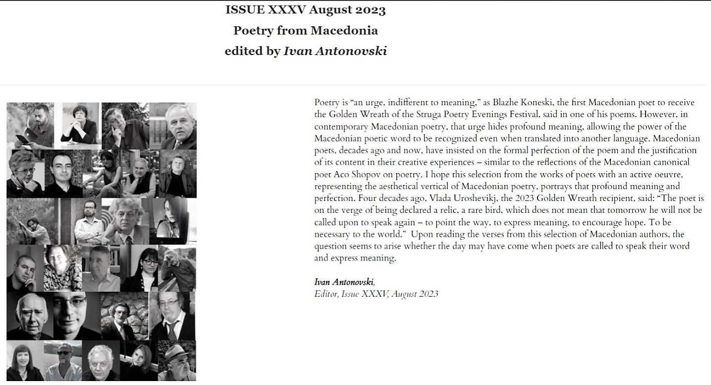 Реномираното меѓународно списание за поезија „Версвил“, својот најнов број во целост го посвети на современото македонско поетско творештво. Изданието е насловено „Поезија од Македонија“ и „Версвил“ го објави во пресрет на Струшките вечери на поезијата (СВП), а на покана на меѓународната редакција на списанието, негов уредник и автор на уводната реч е Иван Антоновски.