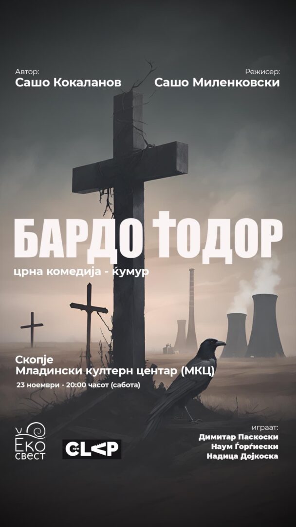 Црната сатирична комедија „Бардо Тодор“, изготвенa во продукција на „New Clаp“, а поддржана од Центарот за истражување и информирање за животната средина „Еко-свест“, ќе се одигра во Младински Културен Центар во Денсинг сала на 23 ноември во 20:00 часот, влезот е слободен.