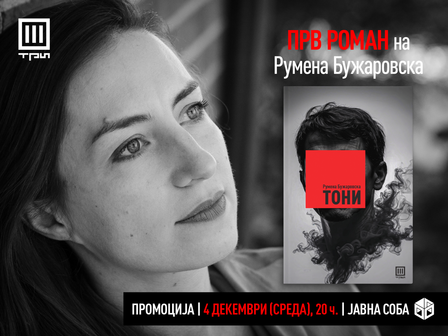 Во „Јавна соба“ во Скопје денеска ќе се одржи промоција на првиот роман на македонската писателка Румена Бужаровска – „Тони“, во издание на „Три“. Романот ќе биде промовиран со разговор меѓу Бужаровска, писателот Петар Андоновски и поетесата и главна уредничка на „Медуза“, Калиа Димитрова.