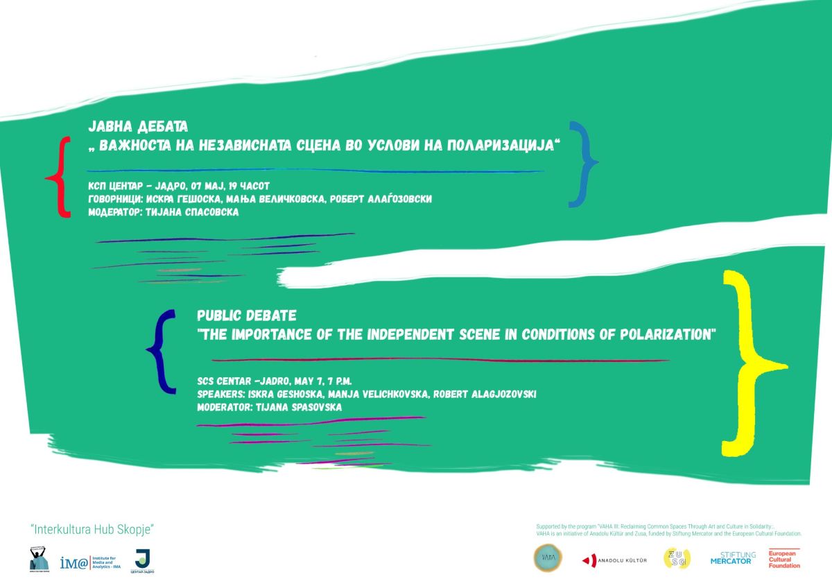 „Важноста на Независната сцена во услови на поларизација“ е тема на јавната дебата што ќе се одржи утре (среда, 7 мај 2025) во КСЦ Центар Јадро во Скопје, со почеток во 19 часот. Говорници ќе бидат Искра Гешоска, Мања Величковска и Роберт Алаѓозовски, а дебатата ќе ја модерира Тијана Спасовска.