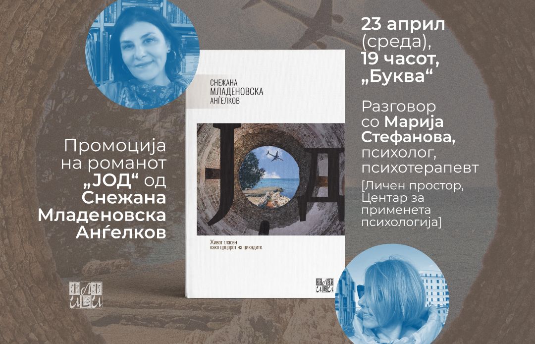 Вечерва во 19 часот во кафе-книжарницата „Буква“ ќе се случи промоцијата на актуелниот роман „ЈОД“ од Снежана Младеновска Анѓелков. Авторката и психологот/психотерапевт Марија Стефанова ќе ја претстават содржината на овој кус, но силен роман објавен кон крајот на минатата, 2024 година за издавачката куќа „Или-Или“.