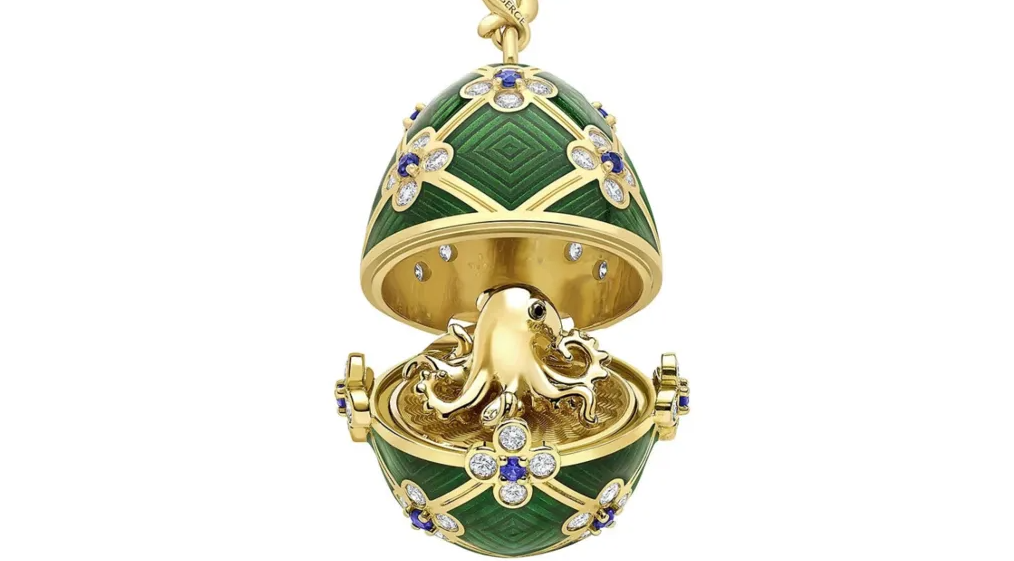 Според описот на златарата, медалјонот содржи 60 бели дијаманти, 15 сини сафири, и во внатрешноста крие минијатурна златна хоботница изработена од 18-каратно злато. Моделот, наречен „Octopussy egg“, е инспириран од филмот за Џејмс Бонд од 1983 година.