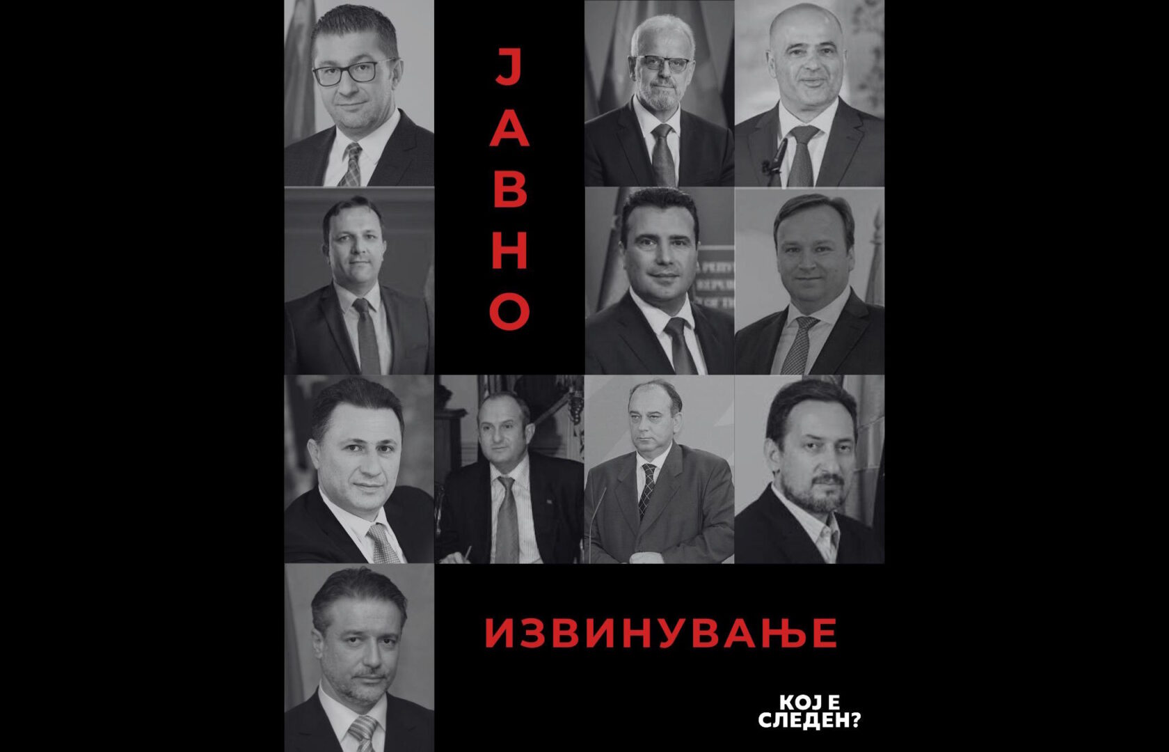 „Граѓанската иницијатива ‘Кој е следен’ јавно им се извинува на сите граѓани што во изминатите 35 години изгради систем кој свирепо ги убива своите деца, ги загадува нашите градови и ја осиромашува нашата држава. Воедно, се извинуваме и за сите системски неправди кои ние сме ги предизвикале од 8 септември 1991 година, па се до денес“ пишуваат тие.
