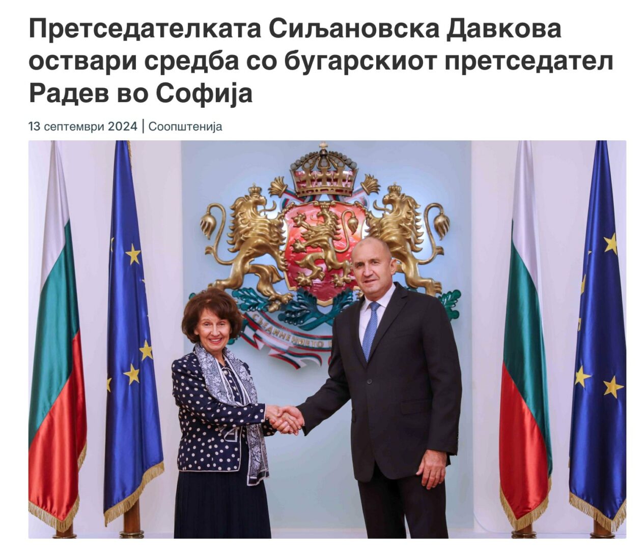 „Она што фрли сенка на настанот е отстапувањето од договорениот протокол за средбата, според кој, не требаше да има фотографии во рамките на затворениот простор. Но, за жал, пред почетокот на тет-а-тет средбата, претседателот Радев ја покани претседателката да направат заедничка фотографија пред бугарското знаме, иако ваков потег и чин не беше предвиден, ниту договорен.“ (Кабинет на претседателката).