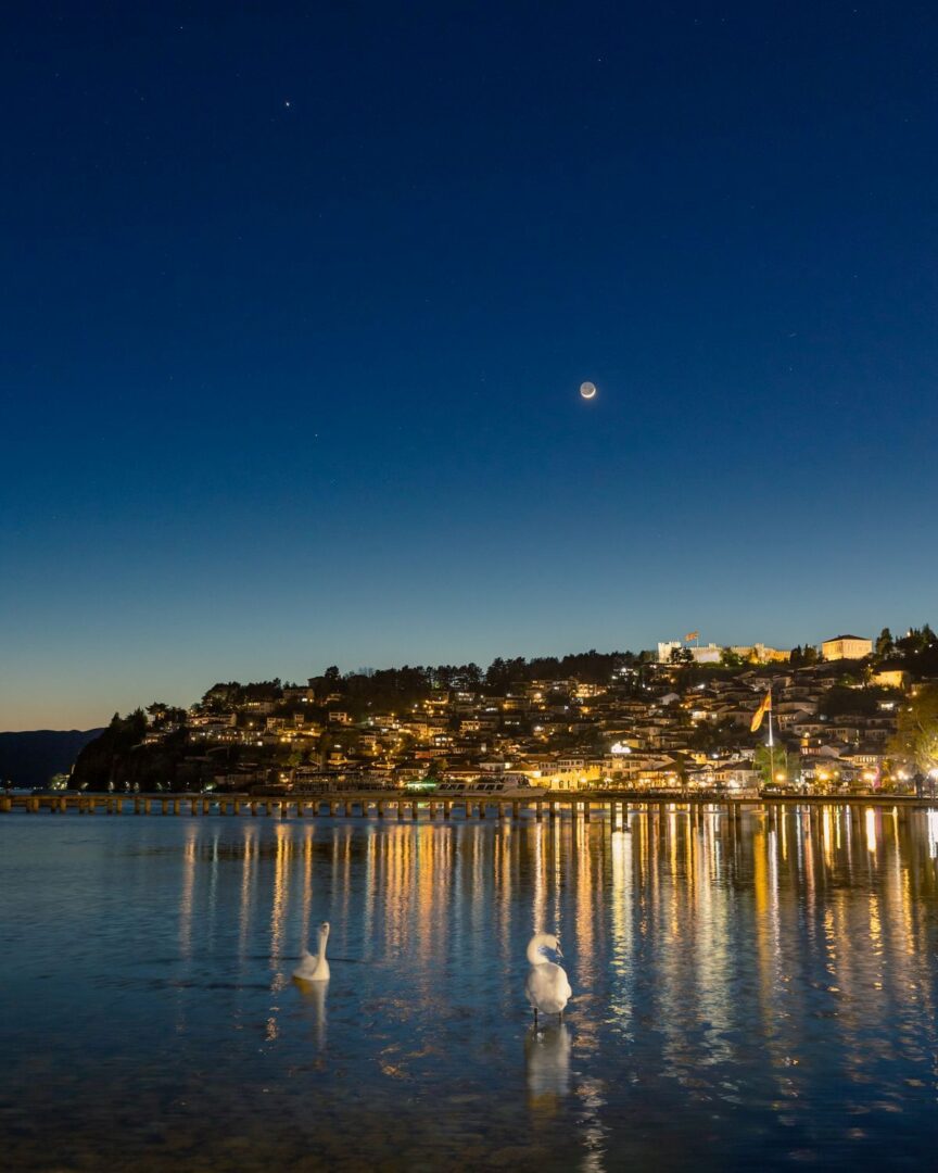 За да ја долови сцената со слаба осветленост, Спироски го зголеми својот ISO на 1000 и го постави отворот на објективот на f/6.3, пред да направи експозиција од 1,6 секунди. Резултатот е хипнотизирачка мешавина од астрономија, природа и човечност, во која градот Охрид фрла ленти светлина врз пар бели лебеди кои се сончаат во мирното езеро. Охридското Езеро се наоѓа на границата помеѓу Северна Македонија и Албанија и се проценува дека е старо некаде помеѓу 3 и 5 милиони години, според НАСА.