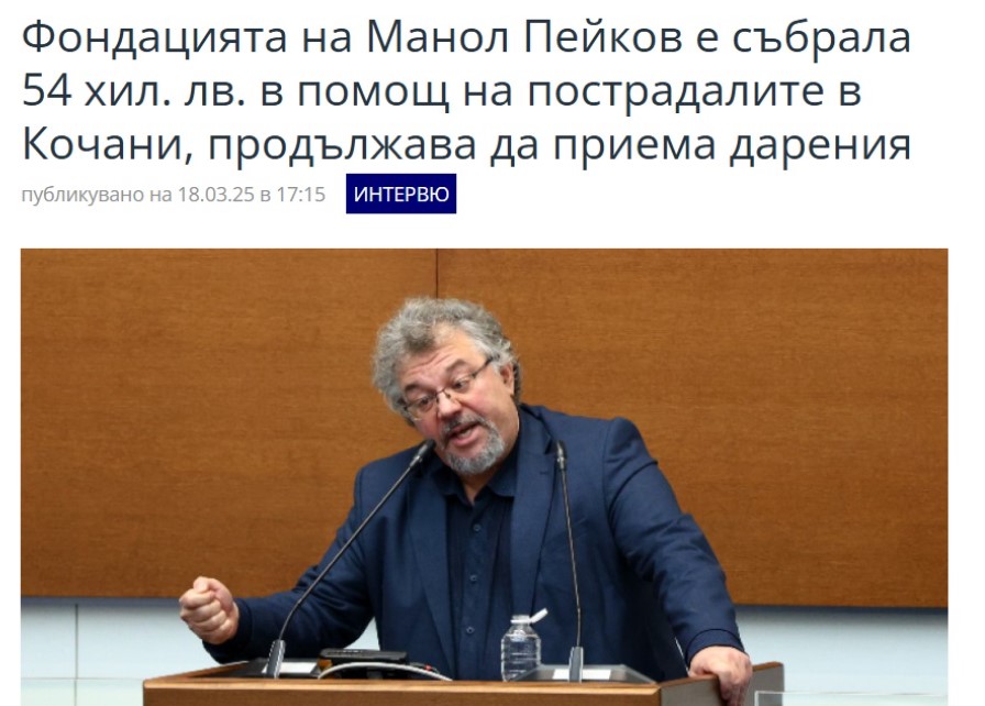 Манол Пејков, пратеник во бугарското собрание, успеа да собере значајна сума од 34.200 евра преку хуманитарна кампања организирана за помош на жртвите од трагичниот пожар во Кочани. Според информациите објавени на бугарскиот портал „Пловдив24.бг“, средствата ќе бидат донирани на семејствата на настраданите.