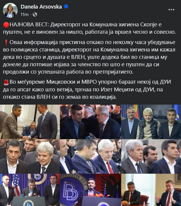 Градоначалничката на Скопје, Данела Арсовска, објави експлозивна порака на Фејсбук со која тврди дека директорот на ЈП „Комунална хигиена“ бил пуштен од полициска станица откако „признал дека е во срцето и душата ВЛЕН“.