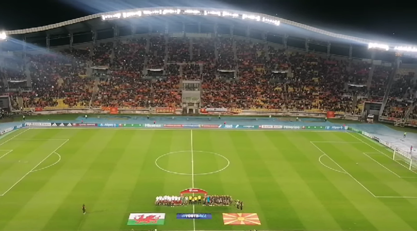 Претходно целата арена „Тоше Проески“ во еден глас ја пееше македонската химна пред мечот на македонската фудбалска А репрезентација против Велс во вториот натпревар од квалификациите за пласман на Светското првенство 2026.