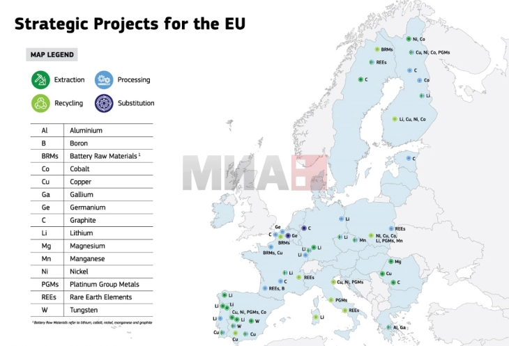 Европската комисија денеска усвои листа од 47 проекти за зајакнување на домашните стратешки капацитети на суровини, што се очекува да го зајакне европскиот синџир на вредност на суровини и да ги диверзифицира изворите на снабдување.